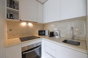 W pełni wyposażony aneks kuchenny oferuje nowoczesne urządzenia takie jak piekarnik, mikrofalówka, płyta grzewcza, lodówka, toster, ekspres do kawy oraz czajnik elektryczny wraz ze stołem jadalnym przeznaczonym do spożywania posiłków. Dodatkowym udogodnieniem jest pralka oraz dostęp windą na wyższe piętra budynku, gdzie mieści się apartament.